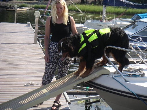 Vi selger svømmevester og noen andre ting. Ikke minst en rampe som er fin å bruke når hundene skal inn i en høy bil eller når de skal med på sjøen. |