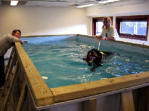 En av mine første kunder var jo deg med bernerjenta Shika og broren til Obermann, Ozzy. Shika var akkurat operert for korsbåndsbrudd. Etter et par ganger i bassenget var godjenta i såpass form at hun gikk opp på soverommet for å sove for natten, noe hun ikke hadde gjort på flere måneder. Hverken Shika eller Ozzy var happy for å gå ut i bassenget, men når de først kom ut i , var det bare gleden. Det å se at bernerbarna dine får strekke ut og bruke bena, er en ren nytelse. |