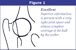 Excellent (Figure 1): this classification is assigned for superior conformation in comparison to other animals of the same age and breed. There is a deep seated ball (femoral head) which fits tightly into a well-formed socket (acetabulum) with minimal joint space. There is almost complete coverage of the socket over the ball.