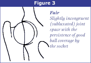 Fair (Figure 3): Assigned where minor irregularities in the hip joint exist. The hip joint is wider than a good hip phenotype. This is due to the ball slightly slipping out of the socket causing a minor degree of joint incongruency. There may also be slight inward deviation of the weight-bearing surface of the socket (dorsal acetabular rim) causing the socket to appear slightly shallow (Figure 4). This can be a normal finding in some breeds however, such as the Chinese Shar Pei, Chow Chow, and Poodle.