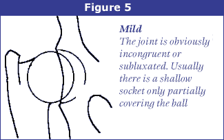 Mild Canine Hip Dysplasia (Figure 5): there is significant subluxation present where the ball is partially out of the socket causing an incongruent increased joint space. The socket is usually shallow only partially covering the ball. There are usually no arthritic changes present with this classification and if the dog is young (24 to 30 months of age), there is an option to resubmit an radiograph when the dog is older so it can be reevaluated a second time. Most dogs will remain dysplastic showing progression of the disease with early arthritic changes. Since HD is a chronic, progressive disease, the older the dog, the more accurate the diagnosis of HD (or lack of HD).