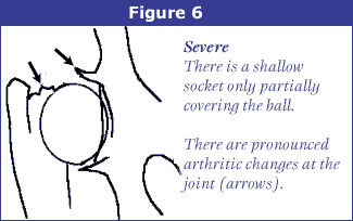 Severe HD (Figure 6): assigned where radiographic evidence of marked dysplasia exists. There is significant subluxation present where the ball is partly or completely out of a shallow socket. Like moderate HD, there are also large amounts of secondary arthritic bone changes along the femoral neck and head, acetabular rim changes and large amounts of abnormal bone pattern changes.
